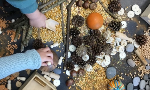 Today we created a sensory tray. There were lots of different smells and textures to explore. We talked about what we could see and used our senses, asking lots of questions. We did not know what the corn was, so Mrs. B put some in a tub, and we listened to it popping. We were so surprised when we saw that we had made popcorn.