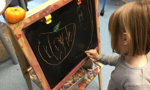 We have got an autumnal display in our window. Some children showed an interest in the small pumpkin and chose to draw it.