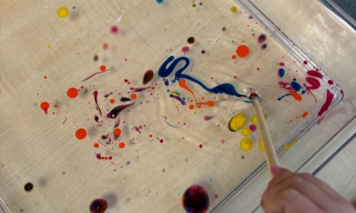 We used marbling inks to create firework pictures. We used our small motor skills to open and squeeze the ink bottles. Then we used our large motor skills to splatter paint on large pieces in the garden, creating more firework patterns.