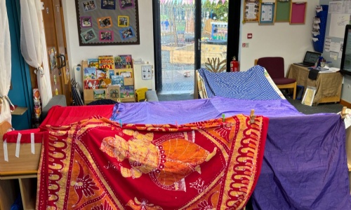 Our huge sheets of material help us to create wonderful dens, this one stayed up for 4 hours today. We kept adding to it, and it ended up with a tunnel entrance, a front room, a bedroom and a kitchen with ALL the accessories.
