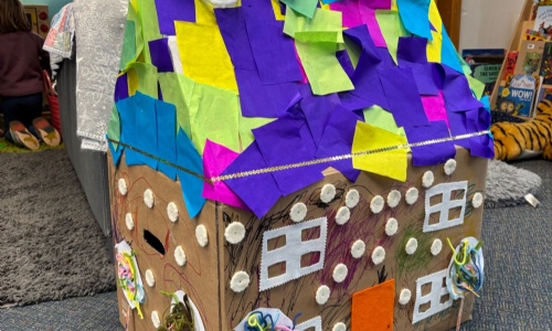 We made a gingerbread house today. We looked at photos of real gingerbread houses and made pretend candy canes and lollipops to decorate it. We have put it in our entrance hall as we are so proud of what we have made together.